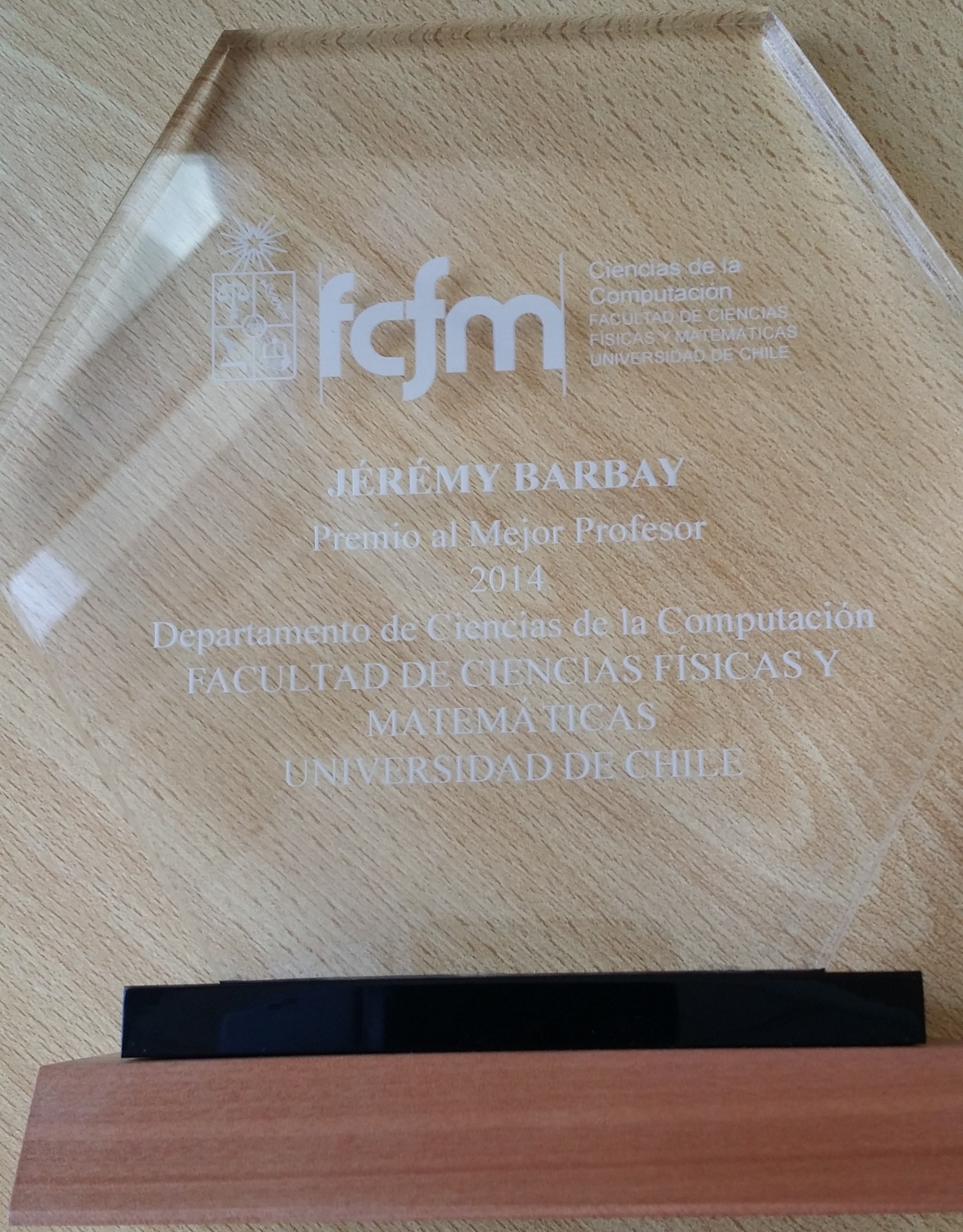 I received the award of "mejor profesor del año académico 2014" (best professor for the academic year 2014) in the Department of Computer Science (DCC) of the Faculty of Physical and Mathematical Sciences of the University of Chile in Santiago, Chile.